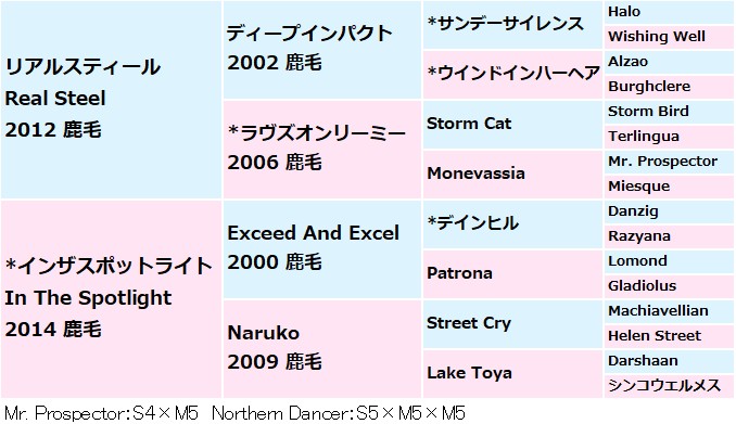 近親にイングリッシュローズ(バランシーン-G2、ケイプヴァーディ-G22着、ジェニーワイリーS-G12着)、ディーマジェスティ(皐月賞-G1、セントライト記念-G2)、タワーオブロンドン(スプリンターズS-G1、セントウルS-G2)など。